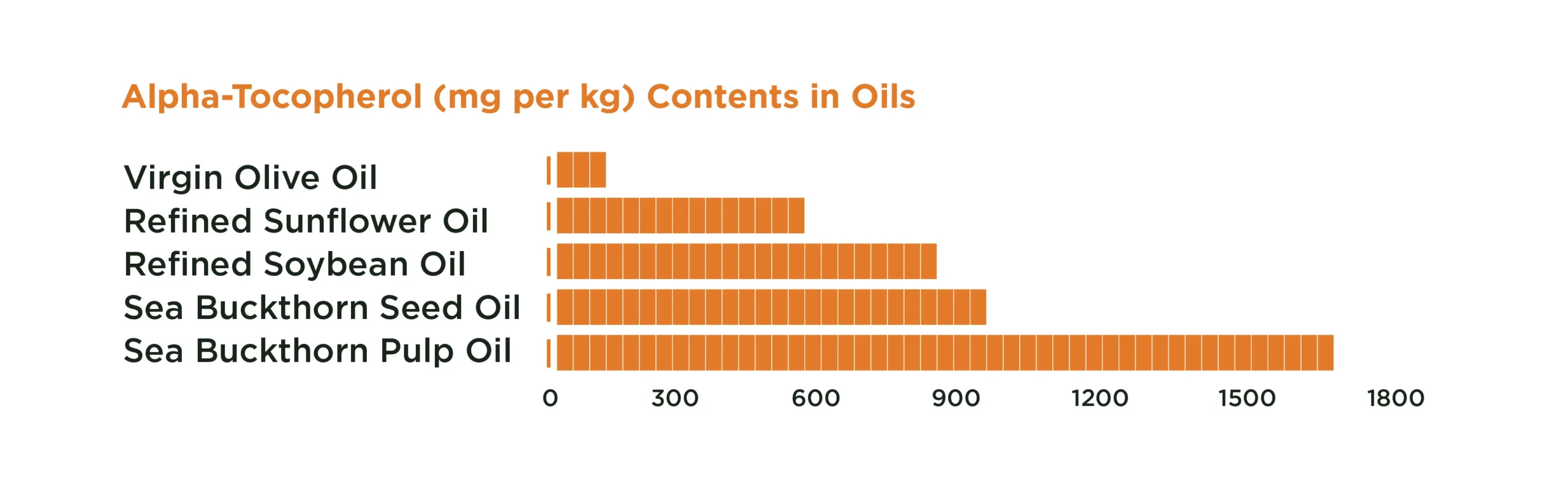 Powerful Source of Vitamin E: Sea Buckthorn is incredibly rich in vitamin E, particularly α-tocopherol, which is a natural antioxidant. Its pulp and seed oil have significantly higher vitamin E levels than tomato paste, spinach, olives, and even avocado. Compared to virgin olive oil and refined sunflower oil, seabuckthorn has considerably more tocopherols, making it a superior natural source. This vitamin supports immune health, prevents cell damage, and helps maintain healthy skin and vision.