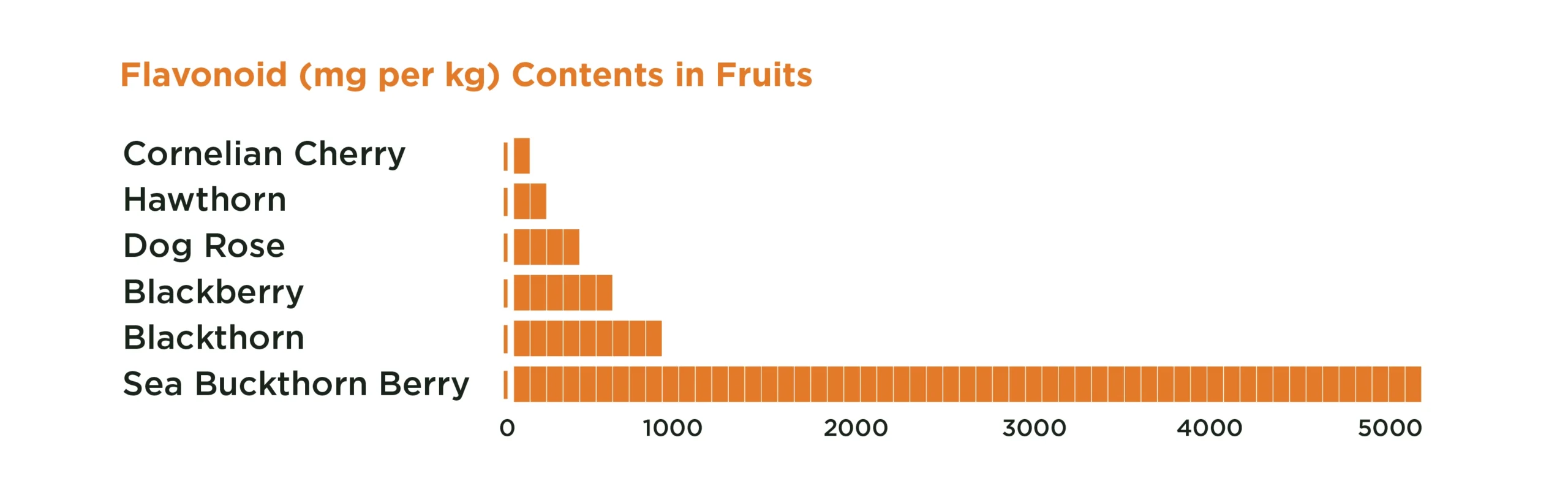 Flavonoid Powerhouse: Sea Buckthorn berries are packed with flavonoids, reaching concentrations up to 8,590 mg/kg. This is far greater than what’s found in hawthorn, blackberry, or dog rose. Flavonoids are known for their antioxidant and anti-inflammatory properties. They help combat oxidative stress and reduce the risk of chronic diseases like cardiovascular issues, diabetes, and even certain cancers. Among the different flavonoids, flavanols are the most dominant in seabuckthorn.